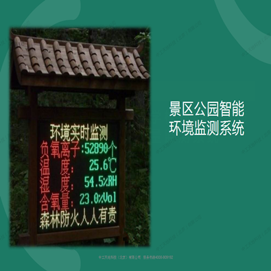 景區(qū)公園綜合環(huán)境監(jiān)測系統(tǒng)可以實現(xiàn)多維一體化,實現(xiàn)對現(xiàn)場溫、濕、光、二氧化碳、臭氧、負(fù)氧離子、一氧化碳、以及粉塵顆粒(PM2.5、PM10)等各類景區(qū)環(huán)境數(shù)據(jù)的實時監(jiān)測。